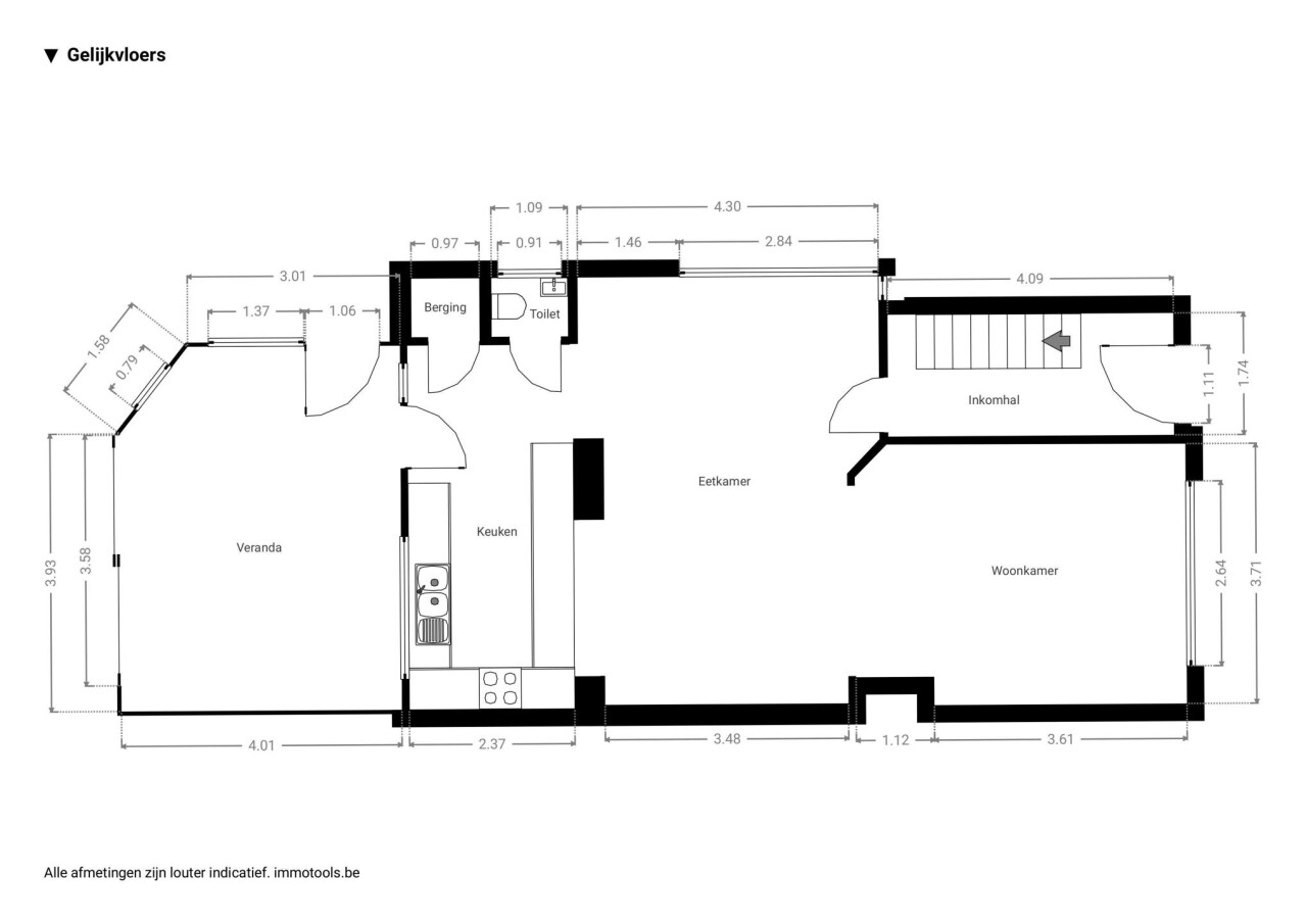 - gelijkvloers: inkomhal, woonkamer, zitkamer, volledig uitgeruste keuken (kookplaat, vaatwasser, spoelbak, koelkast, oven, microgolfoven), voorraadkamer, gastentoilet, veranda